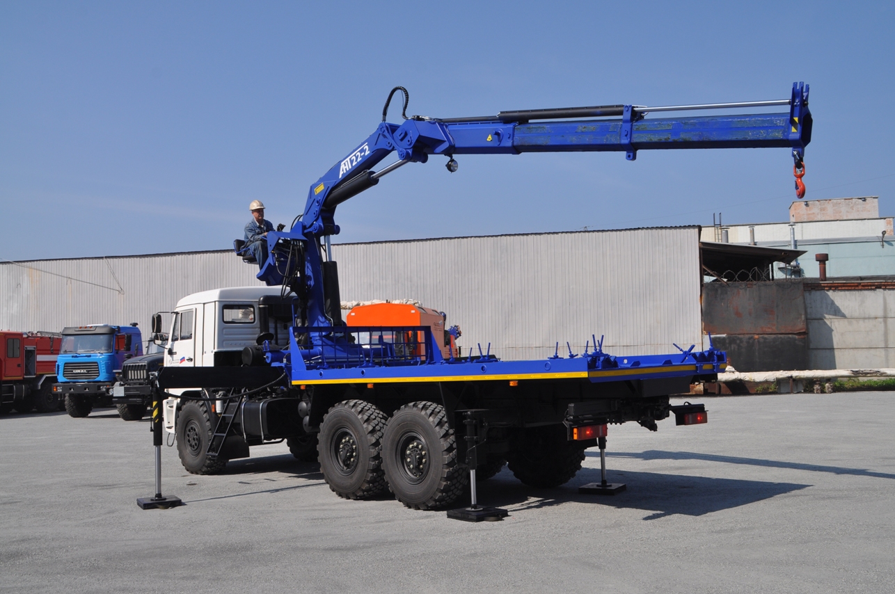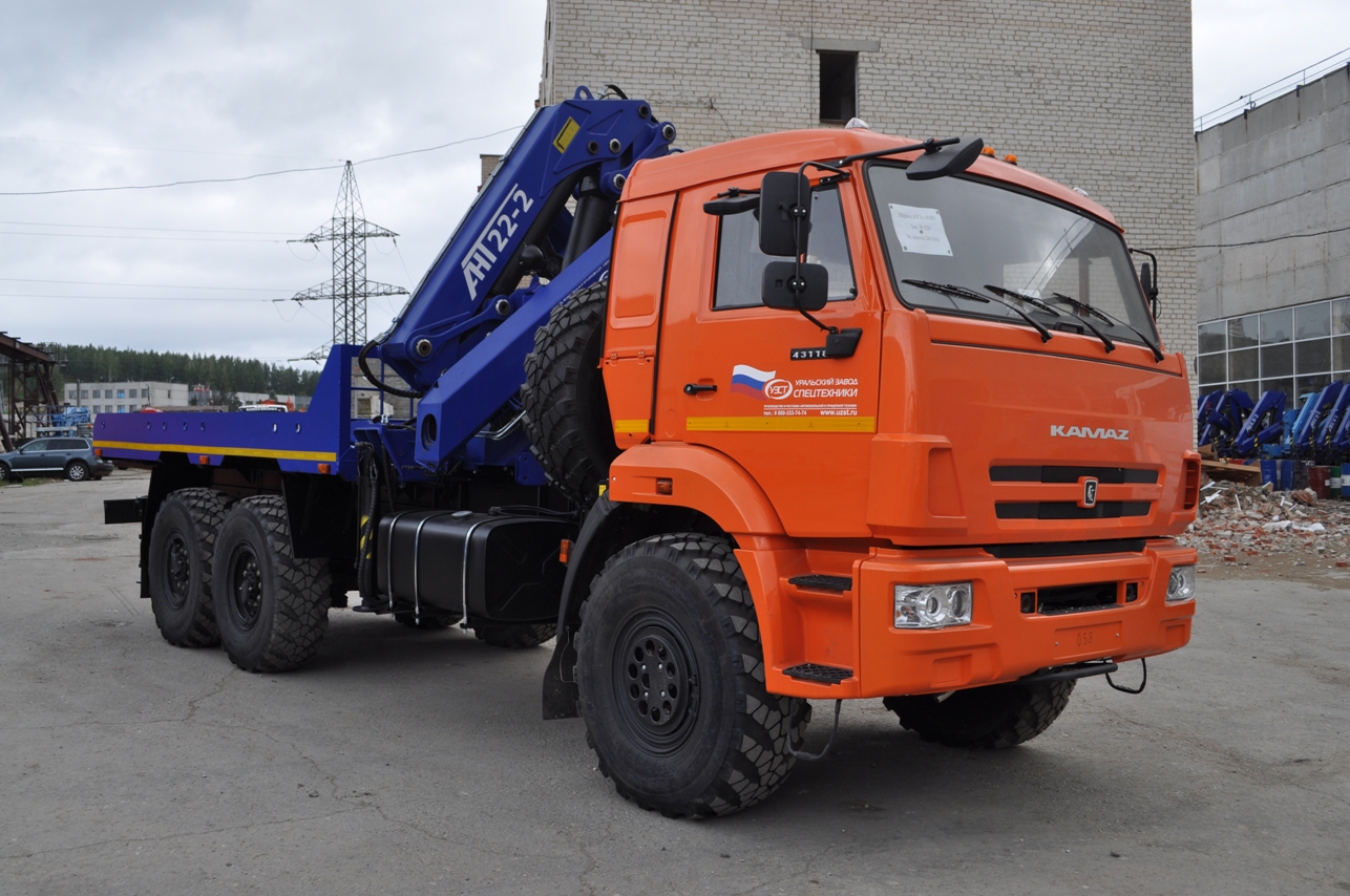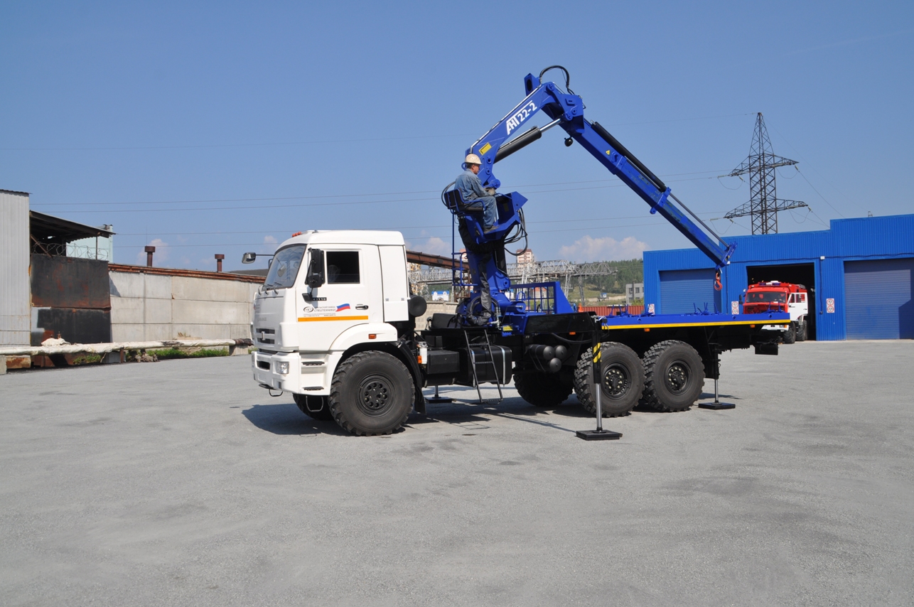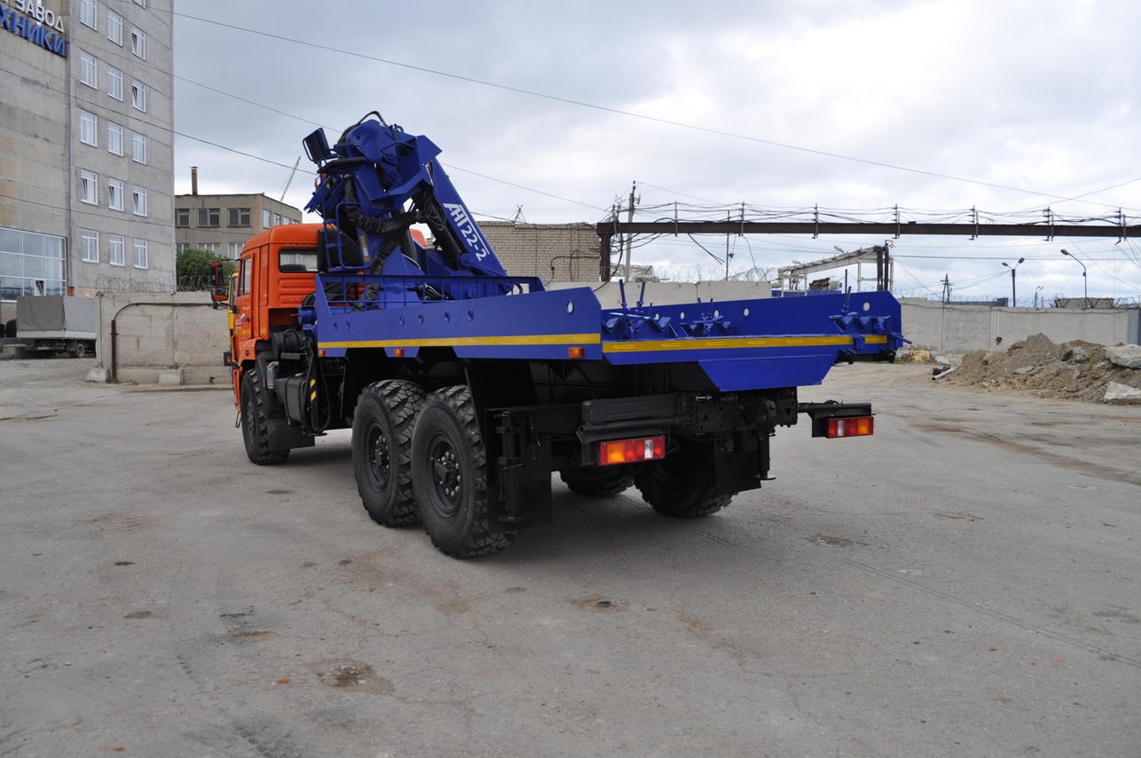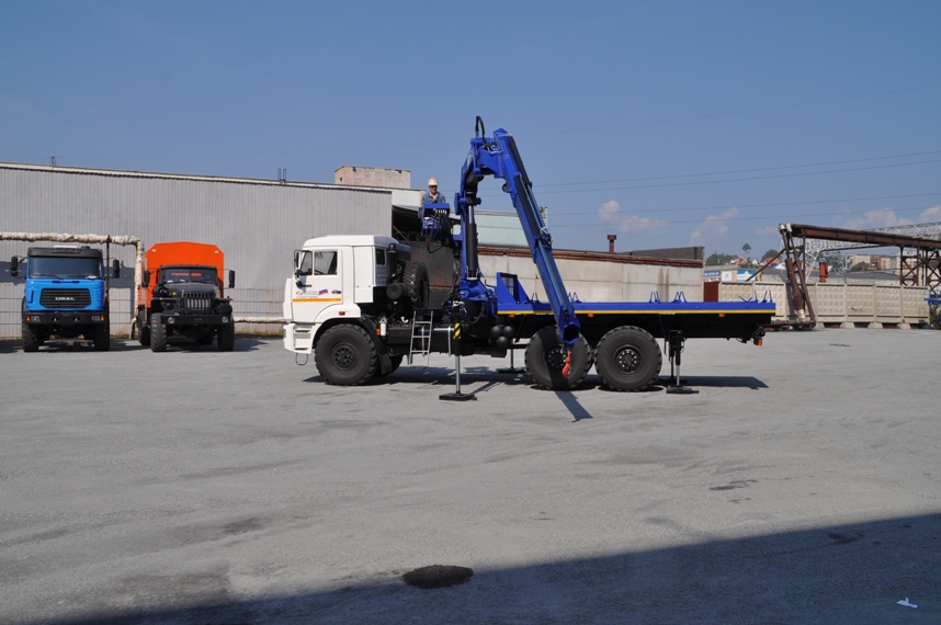 КАМАЗ-43118 со спальным местом, металлическая платформа для перевозки двух кабельных барабанов и насосов, краново-манипуляторная установка АНТ 22-2 грузоподъемностью до 7300 кг и с вылетом до 7,6 метра с управлением с сиденья (верхний пост), средства крепежа, средства безопасности