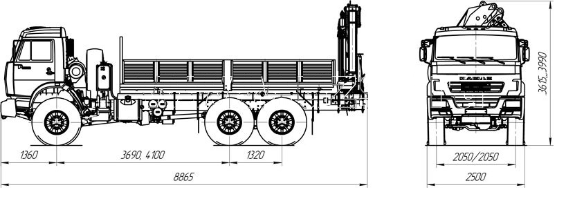 6х6, 300 л.с., коробка передач Камаз-154/ZF9, КМУ: грузовой момент 15 тм, вылет 19 м, г/п 6,6 т