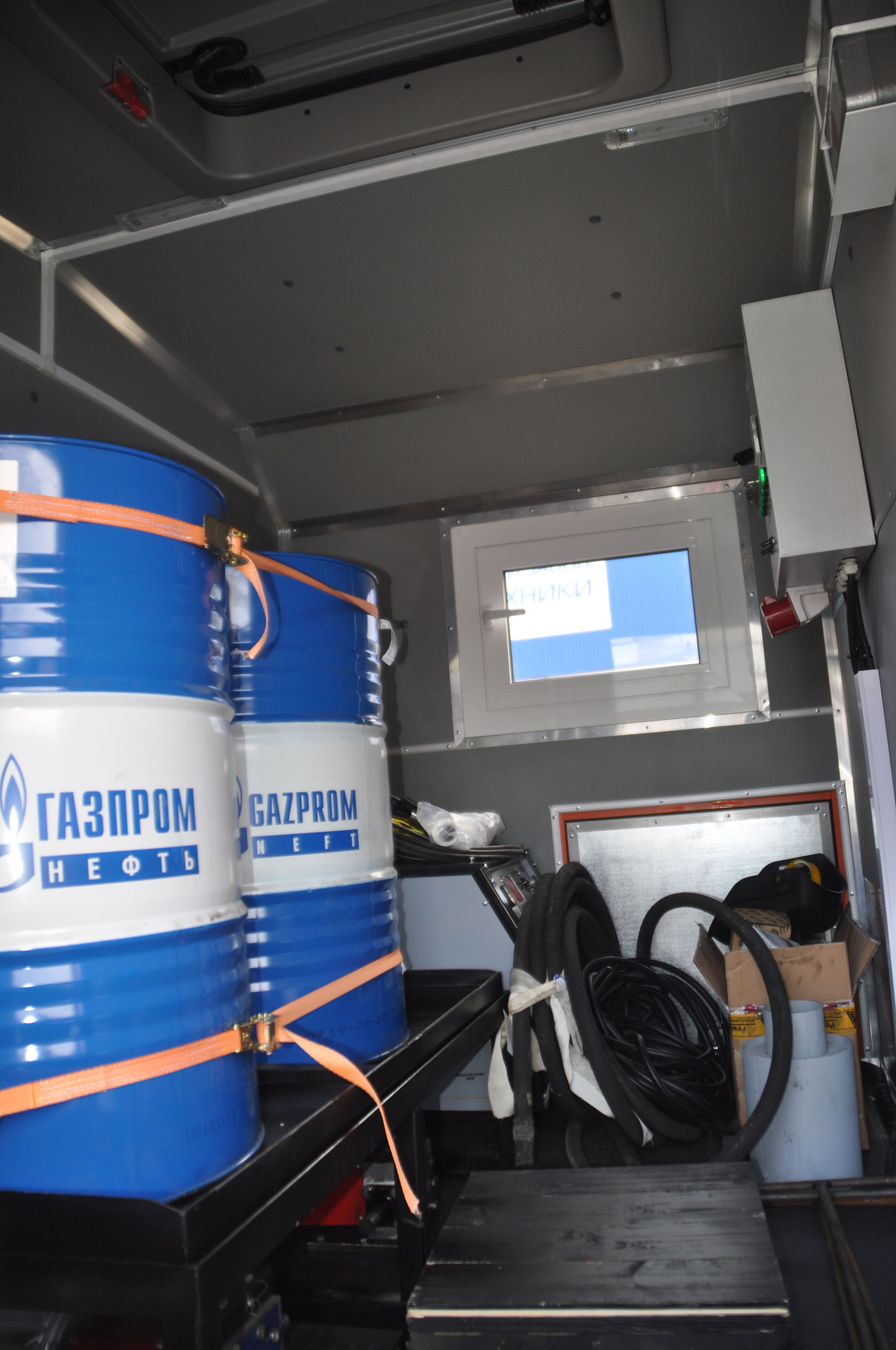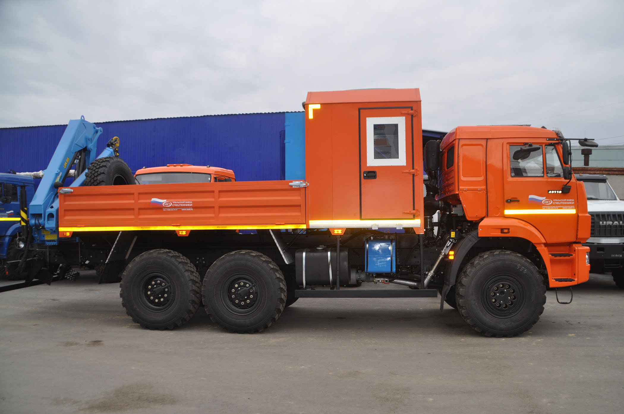 6х6, 300 л.с., коробка передач Камаз-154, пассажирский (3 места) и технологический отсеки, открытая бортовая платформа, генератор EG-202, сверлильный станок, заточный станок, сварочный выпрямитель, солидолонагнетатель, верстак, стол, диван-рундук, макс. г/п КМУ – 4 т.