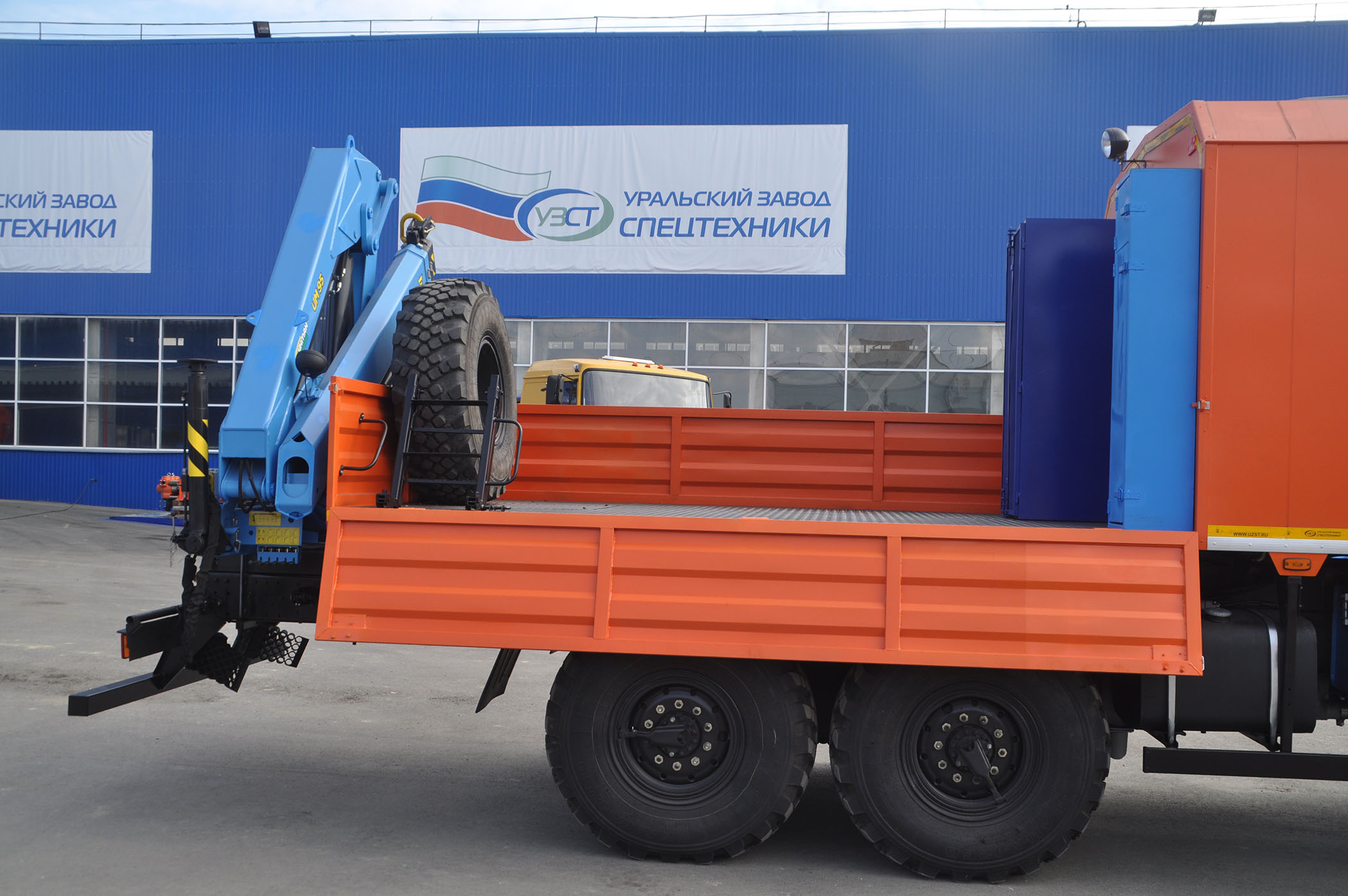 6х6, 300 л.с., коробка передач Камаз-154, технологический отсек, открытая бортовая платформа, генератор EG-202, бочка 200 л – 2 шт., сварочный аппарат, шкаф, макс. г/п КМУ – 4 т.