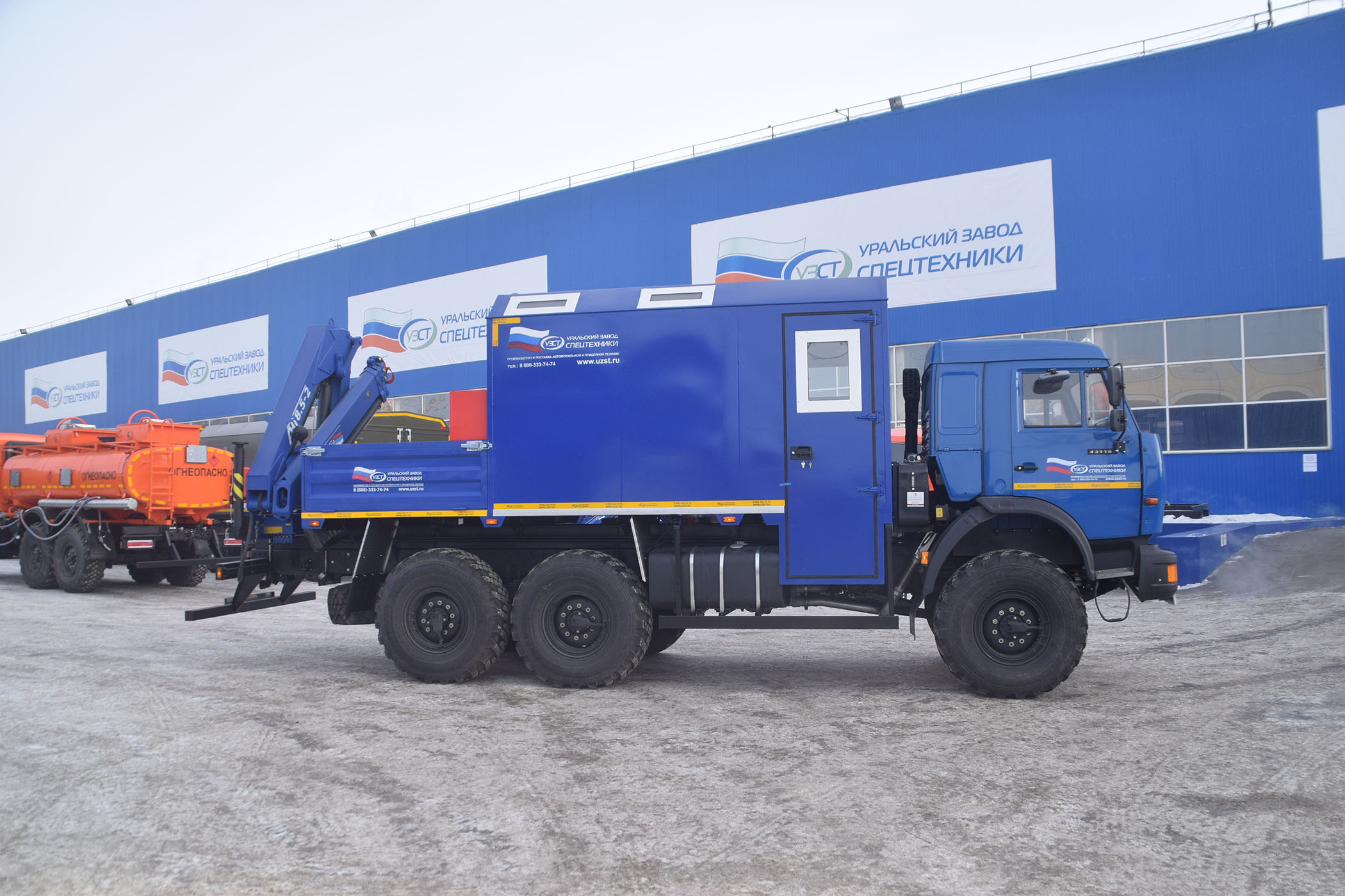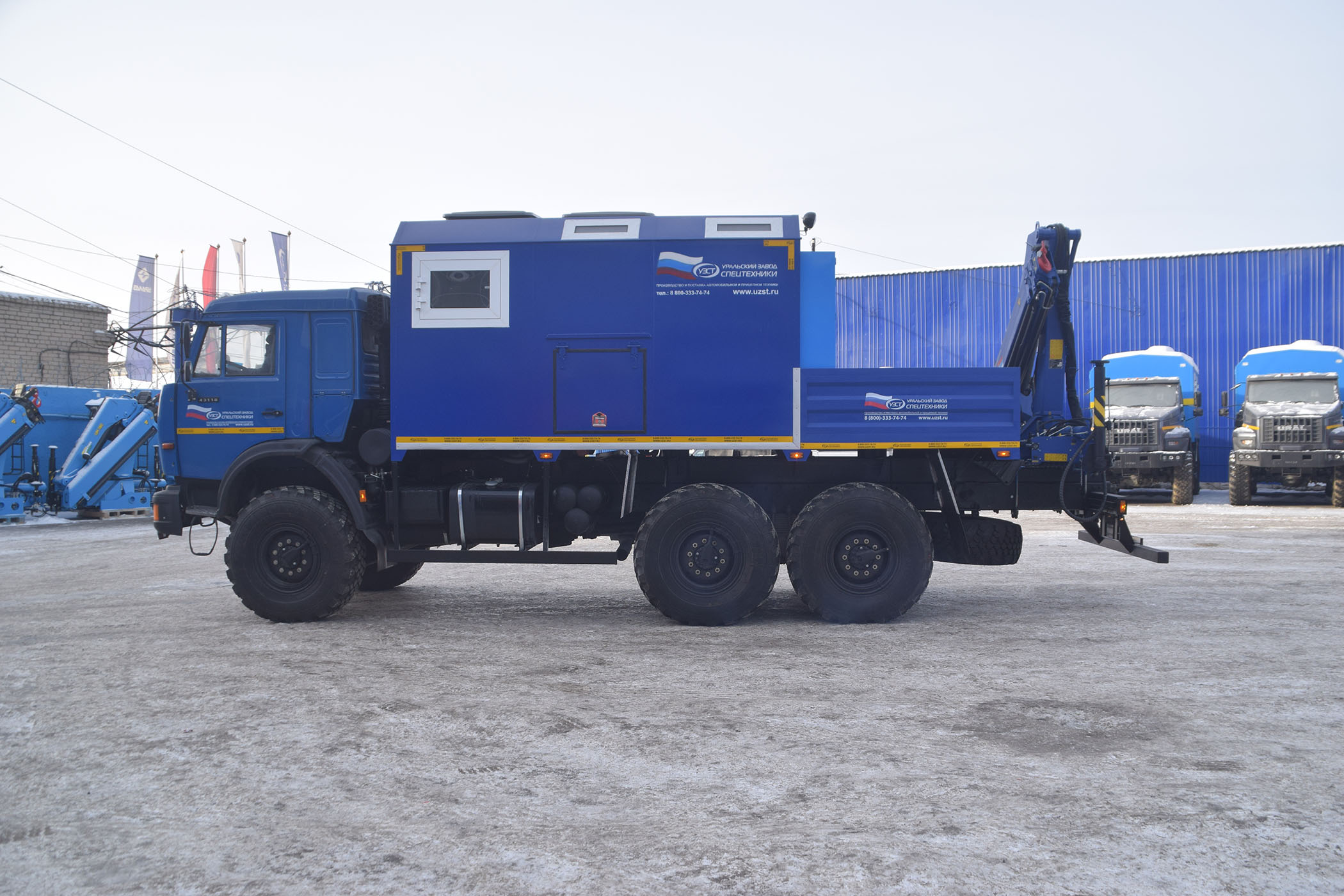 6х6, 300 л.с., коробка передач ZF9, пассажирский (3 места) и технологический отсеки, открытая бортовая платформа, генератор EG-202, вертикально-сверлильный станок, точильно-шлифовальный станок, баки для масла, сварочный выпрямитель, печь для электродов, верстак, стол, диван-рундук, макс. г/п КМУ – 3 т.