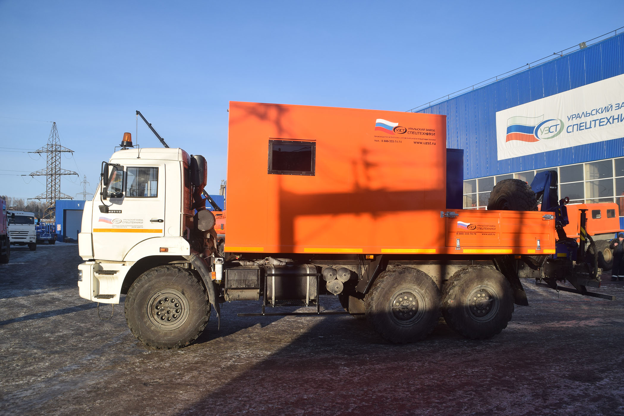 6х6, 300 л.с., коробка передач Камаз-154, пассажирский (2 места) и технологический отсеки, открытая бортовая платформа, генератор EG-202, вертикально-сверлильный станок, точильно-шлифовальный станок, сварочный выпрямитель, печь для электродов, верстак, стол, шкаф, диван-рундук, люлька, макс. г/п КМУ – 6,05 т.