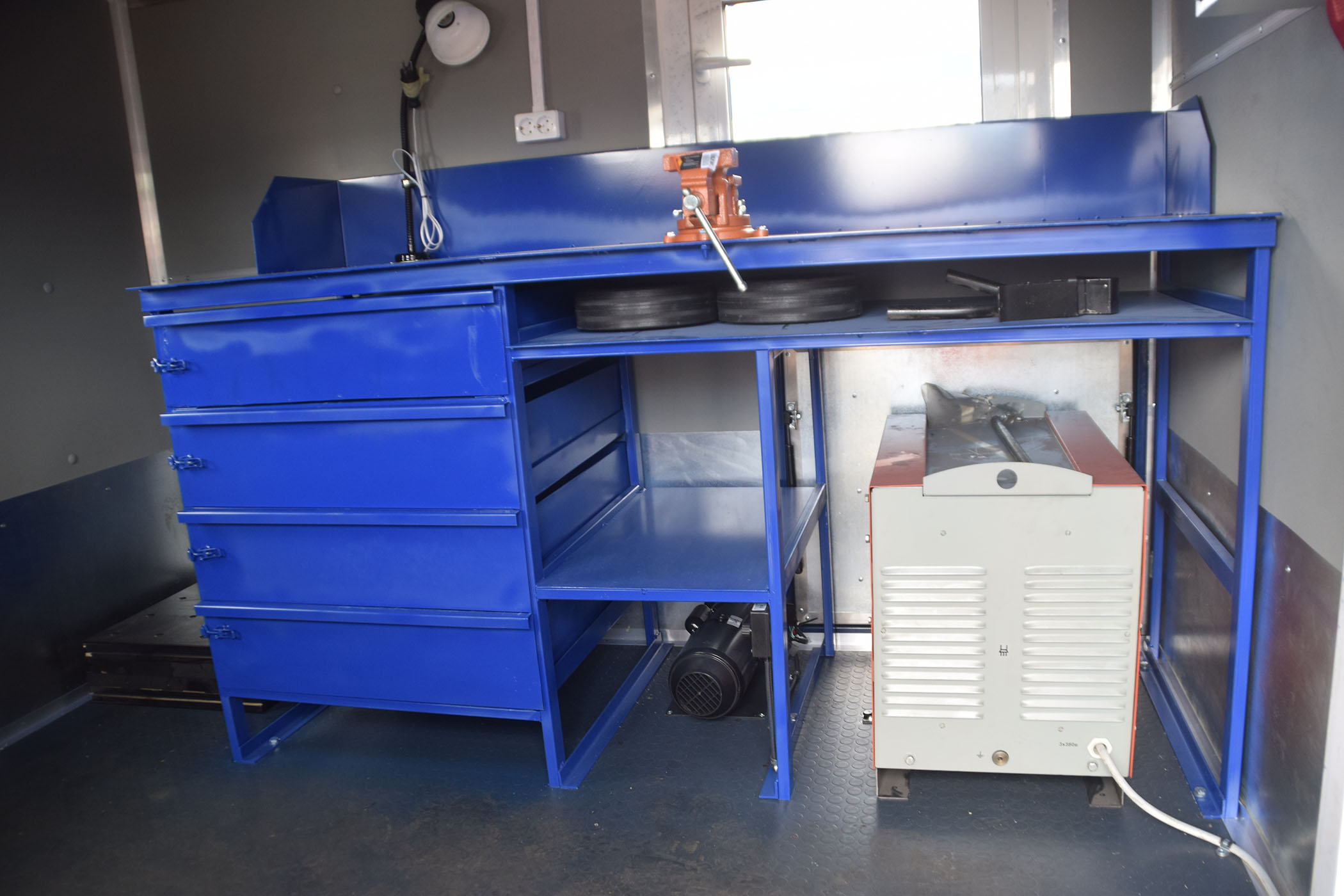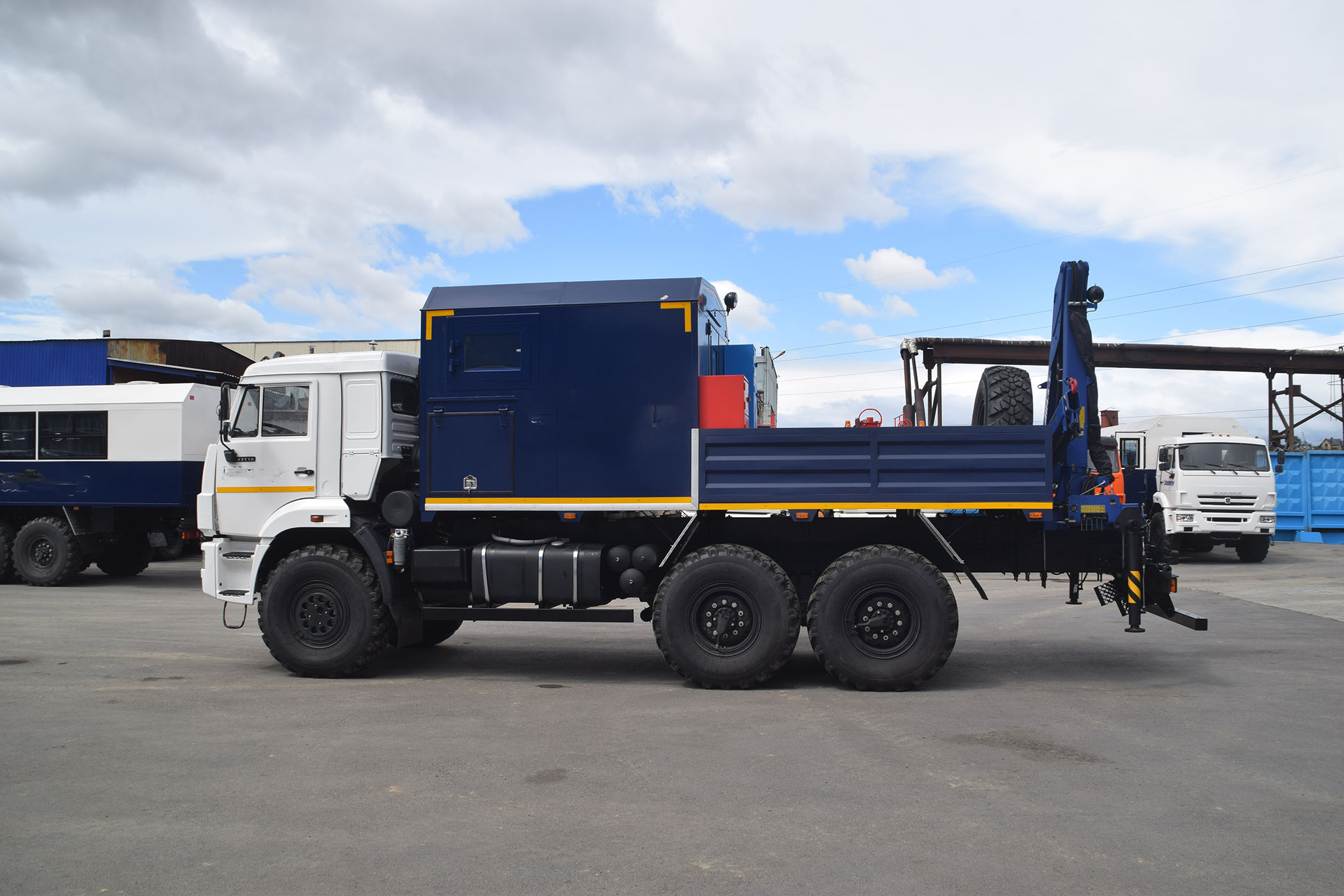 6х6, 280 л.с., коробка передач Камаз-144, пассажирский (6 мест) и технологический отсеки, открытая бортовая платформа, генератор EG-202, сварочный выпрямитель, верстак, умывальник, стол, шкаф, диван-рундук, макс. г/п КМУ – 2 т.