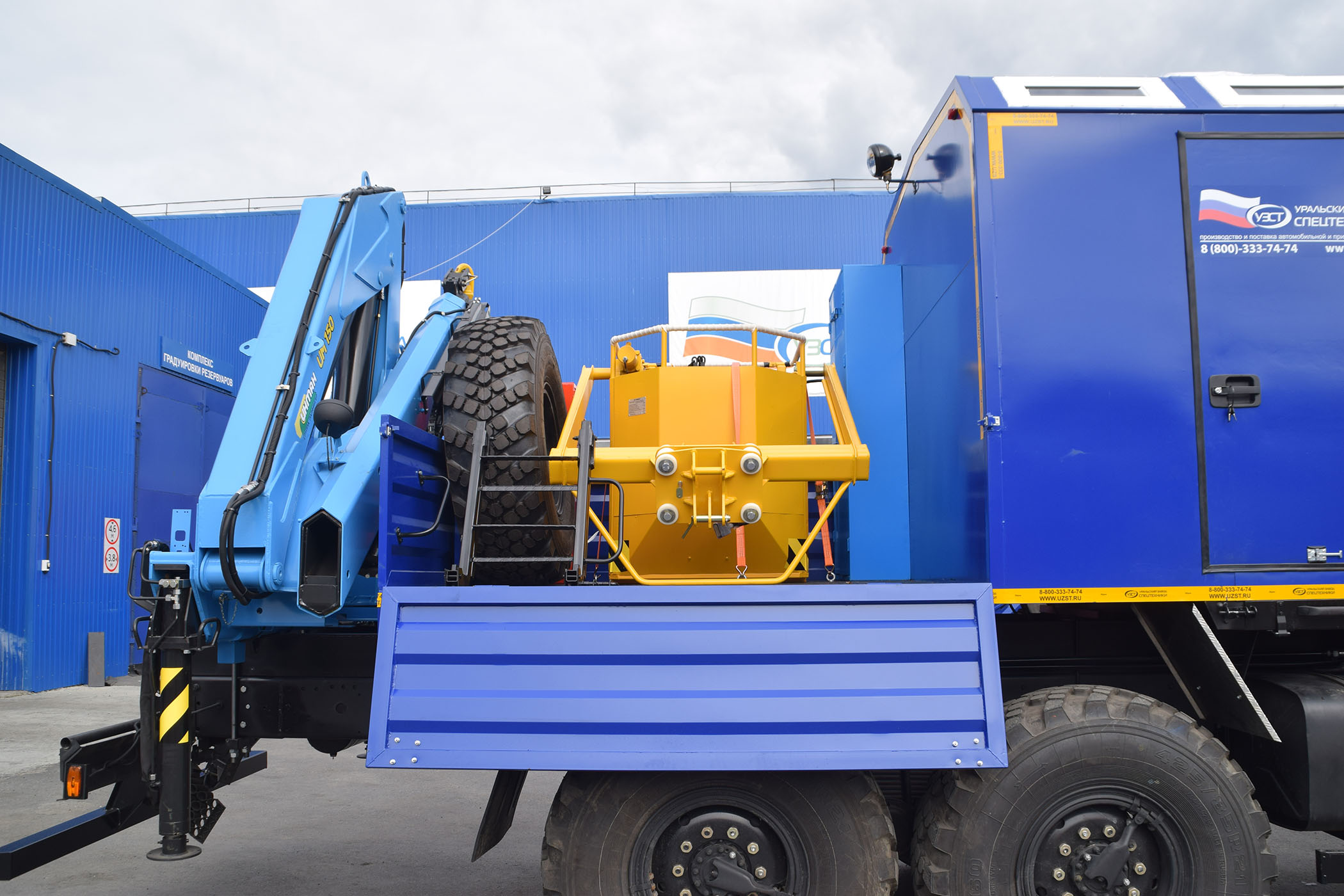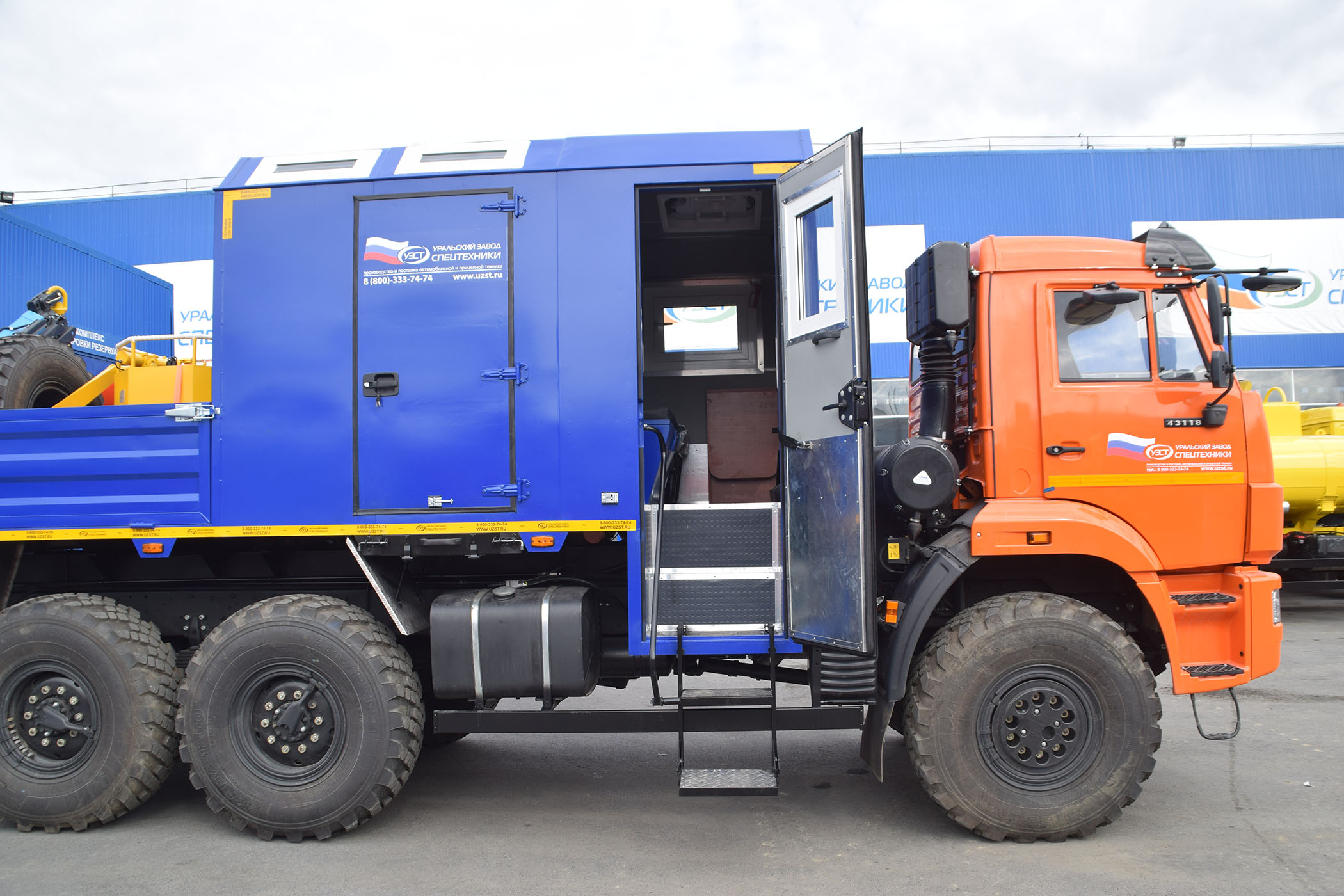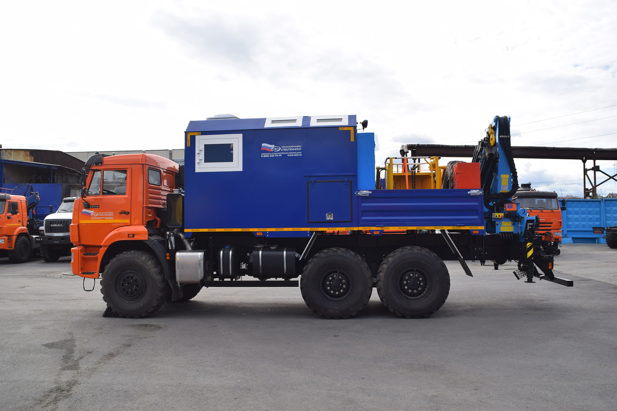 6х6, 300 л.с., коробка передач Камаз-154, пассажирский (3 места) и технологический отсеки, открытая бортовая платформа, генератор EG-202, сверлильный станок, заточный станок, сварочный выпрямитель, солидолонагнетатель, верстак, стол, диван-рундук, макс. г/п КМУ – 4 т.