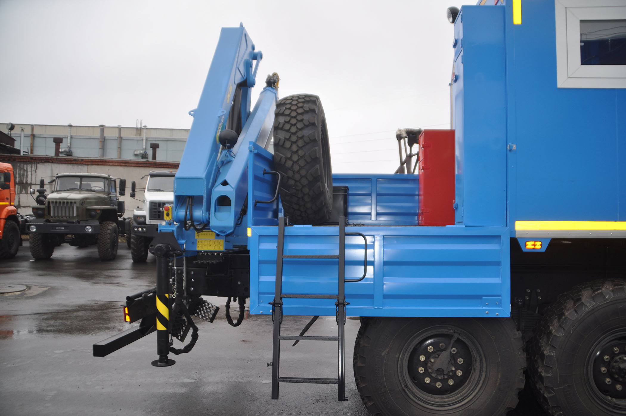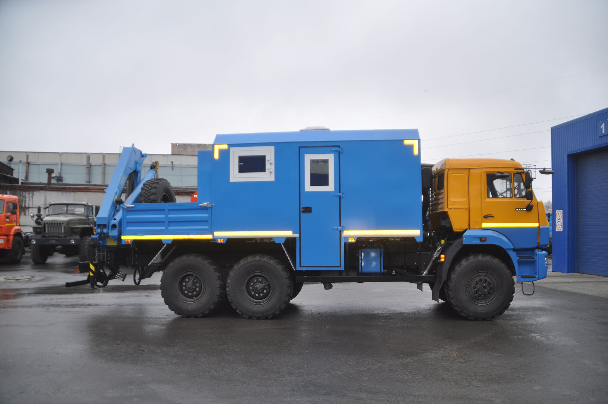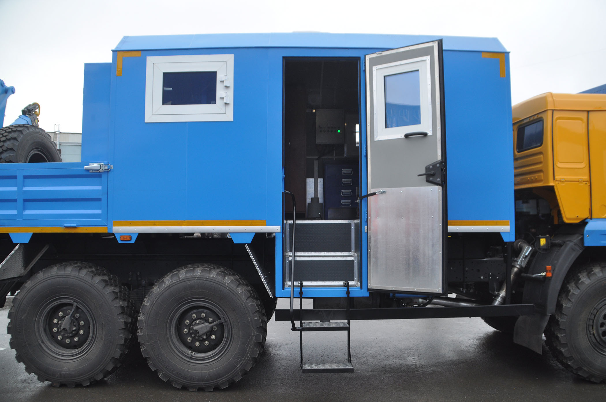 6х6, 300 л.с., коробка передач Камаз-154, пассажирский (3 места) и технологический отсеки, открытая бортовая платформа, генератор EG-202, сварочный выпрямитель, печь для электродов, верстак, стол, диван-рундук, люлька, макс. г/п КМУ – 6,05 т.