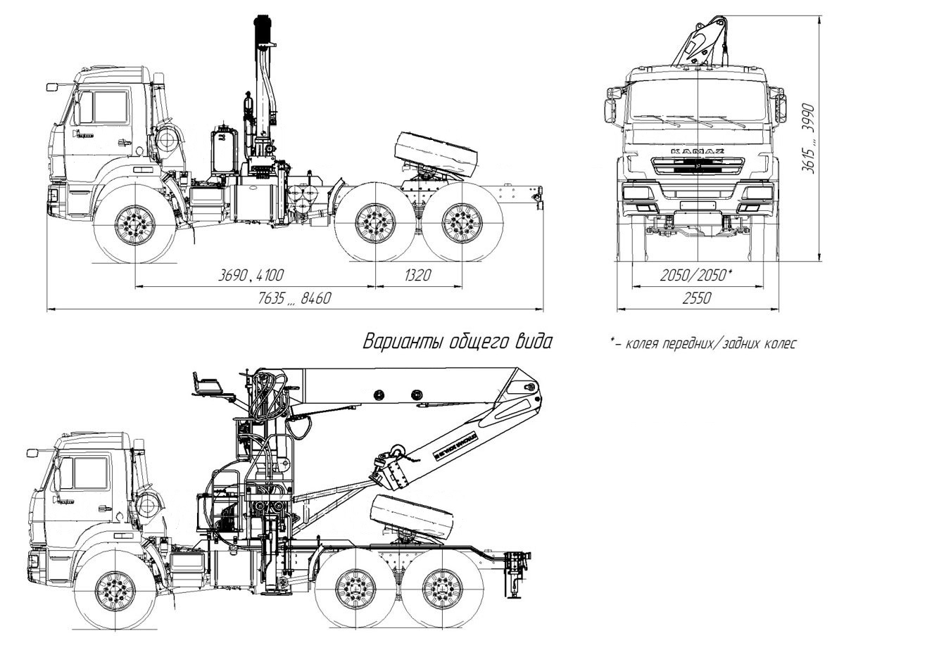 6х6, 300 л.с., коробка передач Камаз-154, КМУ: грузовой момент 13,5 тм, вылет 8 м, г/п 6,16 т.