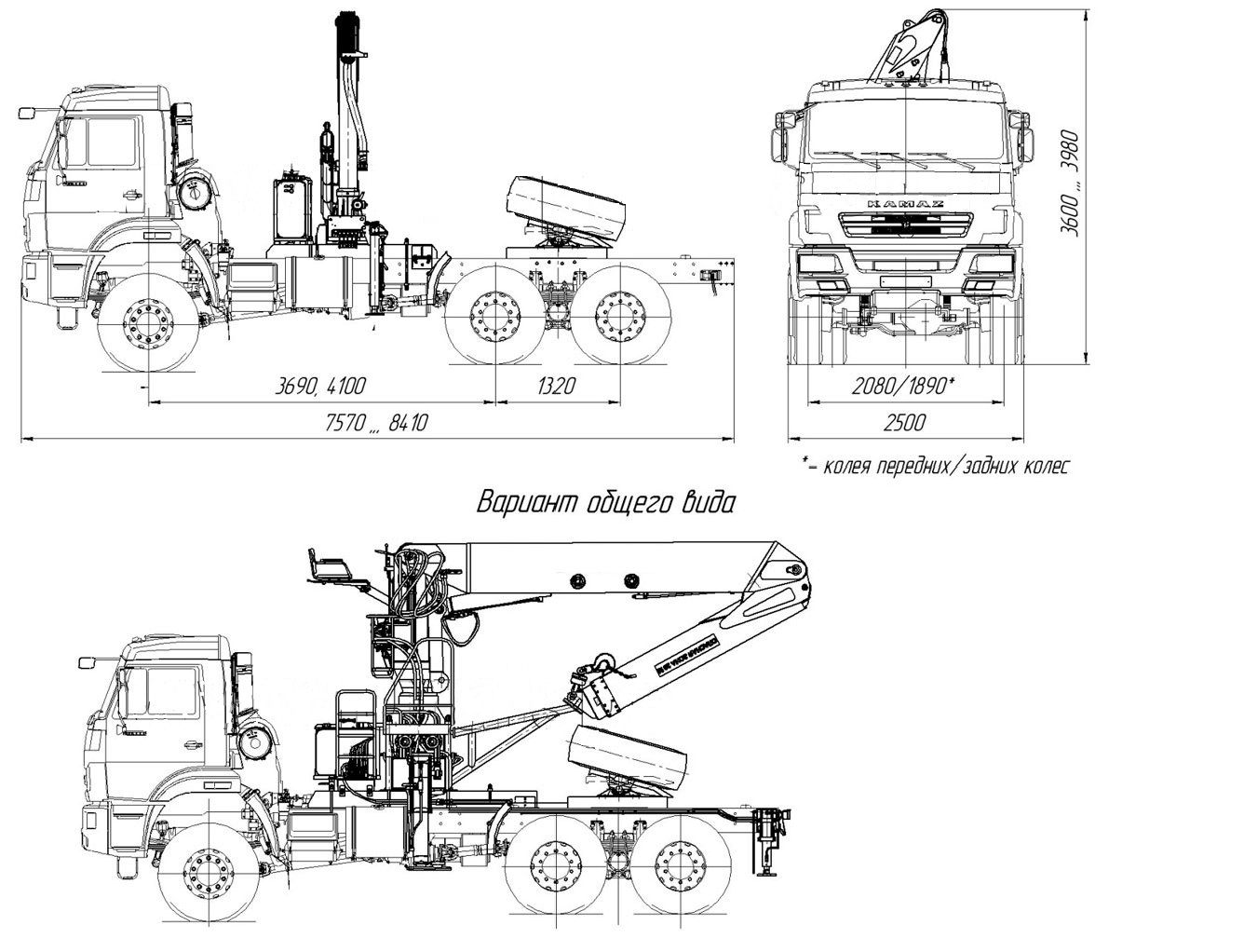 6х6, 300 л.с., коробка передач Камаз-154, КМУ: грузовой момент 15 тм, г/п 6,6 т.