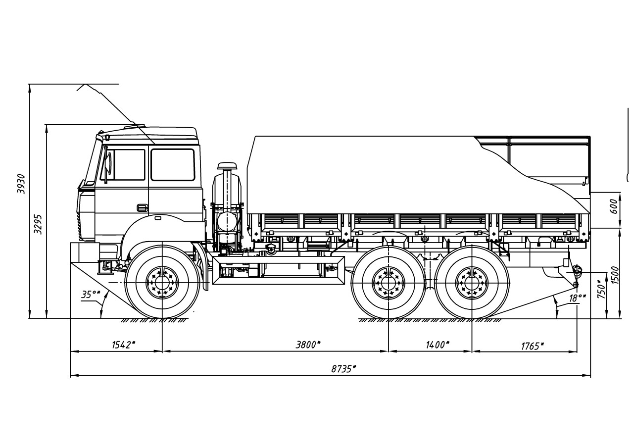 Колесная формула: 6х6 , Модель двигателя: ЯМЗ-53642.10-рядный, Коробка передач: ЯМЗ-1105, механическая, 5-ступенчатая , Тип кабины: над двигателем, двухместная, со спальным местом , Привод тормозной системы: пневматический , Шины: 425/85R21 , Грузоподъемность: 7 т., Номинальная мощность: 285 л.с., Особенности комплектации: Металлическая платформа (L внутр=5660 мм) с дугами и тентом, ДЗК, спальное место, тахограф