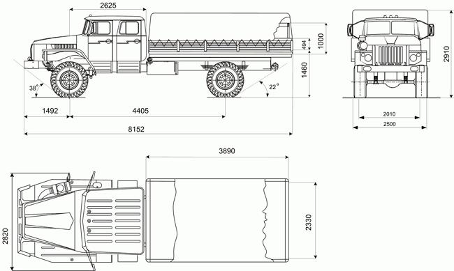| Раздаточная коробка | ОАО «АЗ «УРАЛ», 2-х ступ. с межосевым дифференциалом (высшая передача 1,04; низшая передача 2,15) |